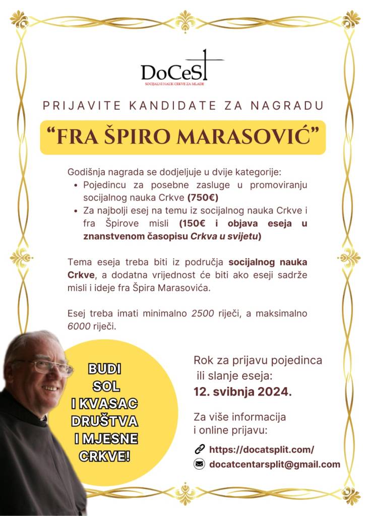 Pozivamo sve zainteresirane udruge, zajednice, župe, biskupije, institucije i sve pojedince da predlože kandidate za Nagradu “fra Špiro Marasović” ili da pošalju svoje eseje za natječaj.